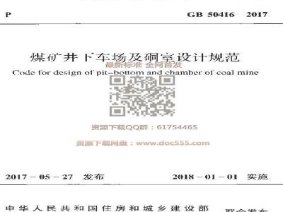 现批准《煤矿舞下率场及能案设纤规范为闻家标准.编号为GR50416-一2017.自2018年1万1日起买瓶。H.第3.0,2(2)、4.5.4(6)、5.1.10,5.1.26,5.1.35,5.1.36、5.2.55.3.5,5.4. 1,5, 4. 3、6. 1. 1(4),6, 3. 1(2),7. 1,13),7.1. 3、7.2. 17.2. 5,9, 1. 1(1,3,4,5),9. 1.2、9.1.3(2,6、7),9. 1,4(2),9.2. 1,9.2.2、9.2.3(2、3、4)10.1.5、10.6.1条(款为强制性条文.必须严格热行。原国家标准煤矿儿底车场砸空设计规范多GL5016-2007煤矿采区车场和瓶室设计规范3GB330334--2009和煤矿片底车场设计规范\GB505352009同时废止:本规范我部标准定额研究所组织中国计划出版社出版发行