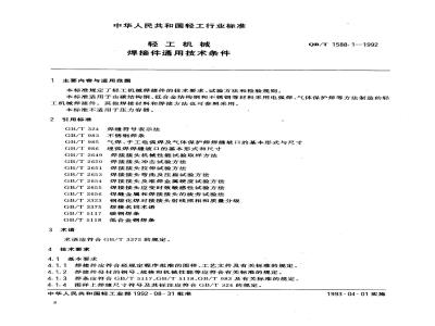 本标准规定了轻工机械焊接件的技术要求、试验方法和检验规则。本标准适用于由碳结构钢、低合金结构钢和不锈钢等材料采用电弧焊、气体保护焊等方法制造的轻工机械焊接件。其他焊接材料和焊接方法也可参照采用。本标准不适用于压力容器。 QB/T 1588.1-1992 轻工机械焊接件通用技术条件 QB/T1588.1-1992 标准下载解压密码:www.bzxz.net