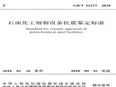 住房城乡建设部关于发布国家标准《石油化工钢制设备抗震鉴定标准》的公告现批准《石油化工钢制设备抗震鉴定标准》为国家标准,编号为GB/T51273一2018,自2018年9月1H起实施。本标准在住房城乡建设部门户网站(mohurd.gov.cn)公开,井由住房城乡建设部标准定额研究所组织中国计划出版社出版发行。