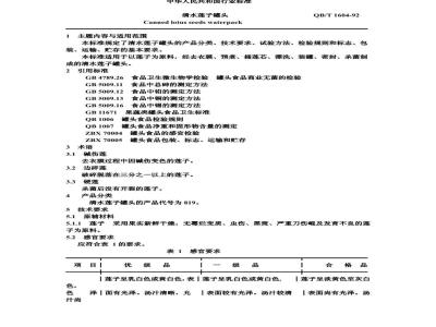 本标准规定了清水莲子罐头的产品分类、技术要求、试验方法、检验规则和标志、包装、运输、贮存的基本要求。本标准适用于以莲子为原料,经去衣膜、预煮、捅莲芯、漂洗、装罐、密封、杀菌制成的清水莲子罐头。 QB/T 1604-1992 清水莲子罐头 QB/T1604-1992 标准下载解压密码:www.bzxz.net