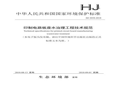 本标准由生态环境部组织制订。本标准主要起草单位:中国环境保护产业协会、广东新大禹环境科技股份有限公司、中国印制电路行业协会、浩蓝环保股份有限公司本标准生态环境部2018年8月13日批准本标准自2018年09月01日起实施。本标准由生态环境部解释