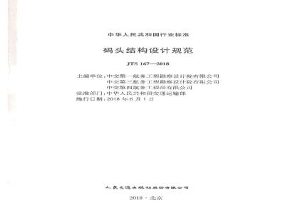 现发布《码头结构设计规范》(以下简称《规范》)。木《规范》为强制性行业标准,编号为TTS167一2018,自2018年6月1月起施行。《格型钢板拼码头设计与施上规程》(JTJ293-98),《斜坡码头及浮码头设计与施T规范》(JTI294一98)、《港口工程嵌岩械设计马施工规程》(JTJ285一2000)、《港工程灌注杜设计』施T规程》(JTJ248-2001)、《港口工程地下连续墙结构设计与施工规程》(JTJ303一2003)《重力式码头设计与施工规范》(JTS167—2—2009)、《板桩码头设计与施工规范》(JTS167—3—2009)、《高桩码头设计与施工规范》(JTS167—1—2010)、《港口工程桩基规范》(JTS167—42012)同时废止。