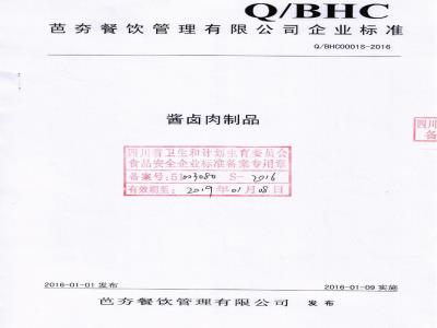 QBHC 0001 S-2016 芭夯餐饮管理有限公司 酱卤肉制品