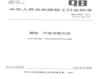 本标准按照GB/T1.1一2009给出的规则起草。本标准是对QB/T2920一2007《箱包行走试验方法》的修订。本标准与QB/T2920一2007相比,除编辑性修改外主要技术变化如下:改变了B法“传送带式行走试验机”中“颠簸板”的要求;改变了B法“试验机运转速度”:细化了B法中“双轮测试”的“试验方法”;增加了水泥测试辊的主要参数的公差。本标准由中国轻工业联合会提出。本标准由全国皮革工业标准化技术委员会(SAC/TC252)归口。QB/T2920-2018