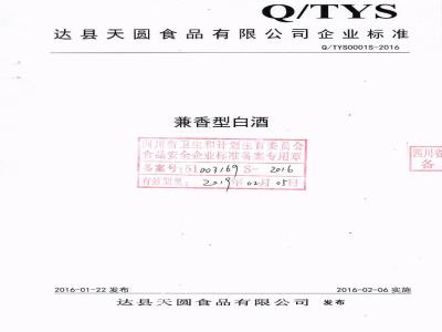 QTYS 0001 S-2016 达县天圆食品有限公司 兼香型白酒