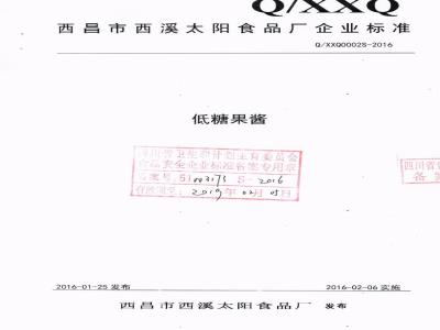 依据《中华人民共和国食品安全法》及《中华人民共和国标准化法》规定,按照卫生部《食品安全企业标准备案办法》及《四川省食品安全企业标准备案办法》要求,本厂参照GB/T22474《果酱》并结合产品特性,按照GB/T1.1《标准化工作导则糖果酱》标准,作为组织生产依据。本标准由西昌市西溪太阳食品厂提出。本标准起草单位:西昌市西溪太阳食品厂。本标准主要起草人:左少清