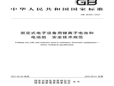 GB 40165-2021 固定式电子设备用锂离子电池和电池组 安全技术规范