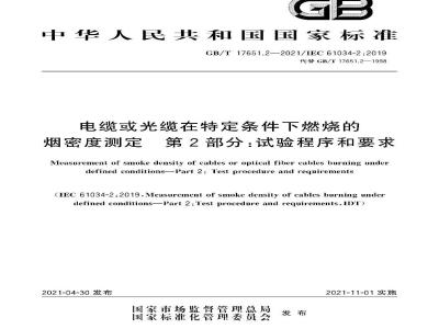 GB/T17651.2—2021/IEC61034-2:2019电缆或光缆燃烧时的烟密度是评估电缆或光缆燃烧性能的重要指标。在火灾发生时,电缆或光缆的低烟特性对保证各类人员的安全撤离和消防救援工作的正常开展,对社会公共安全和减少火灾损失具有重要作用:GB/T17651是测定电缆或光缆准火灾发生时发烟性的基性试验方法:GB/T17651台在确立针对不同电线电缆或光缆产品在特定条件下燃烧的烟密度的试验方法标准.拟由以下2个部分构成。