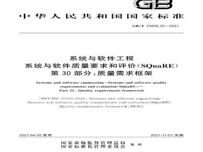 Systems and software engineering-Systems and software qualityrequirementsand evaluation(SOuaRE)-Part30:Qualityrequirementsframework[ISO/IEC25030:2019,Systems and software engineeringSystcms and softwarc quality rcquircmcnts and cvaluation(SQuaRE)Quality requirements framework,MODJ2021-04-30发布