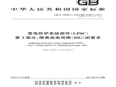 GB/T33588的本部分涉及根据IEC62305系列标准设计和安装的需电防扩系统(LPS)所来用的隔离放电问隙(ISG)的要求和试验方法rrKaeerkAca-