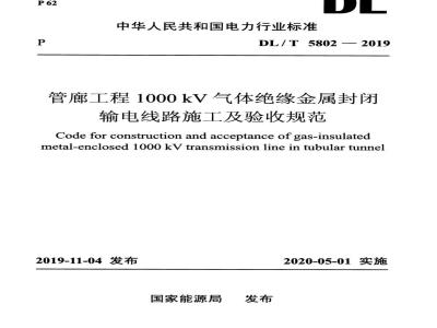 Code for construction and acceptance of gas-insulated metal-enclosed1000kVtransmissionlineintubulartunnelDL/T5802—2019