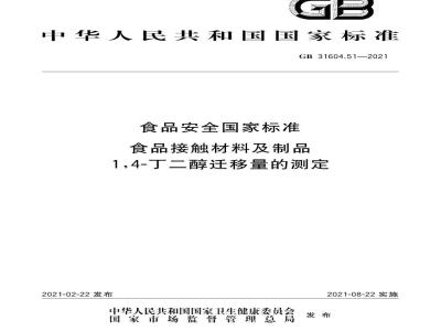 本标准规定了食品接触材料及制品中1,4-丁二醇迁移量的测定方法。GB31604.51—2021