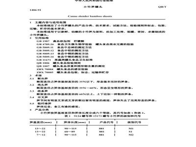 本标准规定了小竹笋罐头的产品分类、技术要求、试验方法、检验规则和标志、包装、运输、贮存的基本要求。本标准适用于以新鲜、幼嫩的小竹笋为原料,经加工处理、装魄、密封、杀菌制成的小竹笋罐头。 QB 1406-1991 小竹笋罐头 QB1406-1991 标准下载解压密码:www.bzxz.net