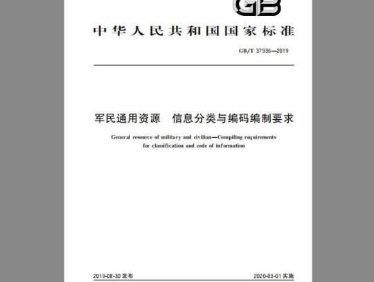 标准名称:GB/T 37936-2019 军民通用资源 信息分类与编码编制要求