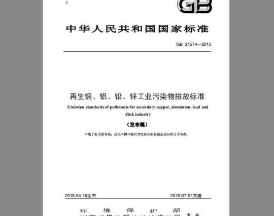 标准名称:GB 31574-2015 再生铜、铝、铅、锌工业污染物排放标准