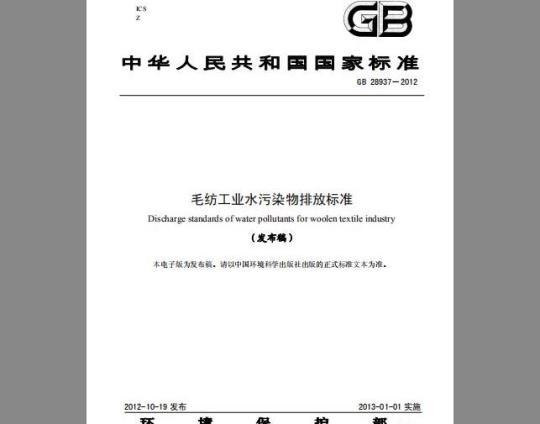 标准名称:GB 28937-2012 毛纺工业水污染物排放标准