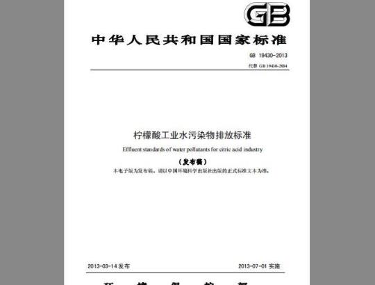 标准名称:GB 19430-2013 柠檬酸工业水污染物排放标准