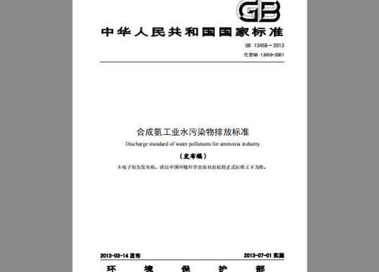 根据落实国家环境保护规划、环境保护管理和执法工作的需要,调整了控制排放的污染物项目,提高了污染物排放控制要求;取消了按污水去向分级控制的规定:一一为促进地区经济与环境协调发展,推动经济结构的调整和经济增长方式的转变,弓导合成氨工业生产工艺和污染治理技术的发展方向,规定了水污染物特别排放限值;一一为完善国家环境保护标准体系,规范水污染物排放行为,适应国家水污染防治工作的需要,增加了水污染物间接排放限值。本标准实施之日起,《合成氨工业水污染物排放标准》(GB13458一2001)同时废止。地方省级人民政府对本标准未作规定的污染物项目,可以制定地方污染物排放标准:对本标准已作规定的污染物项目,可以制定严于本标准的地方污染物排放标准。本标准由环境保护部科技标准司组织制订。本标准主要起草单位:中国环境科学研究院。本标准环境保护部2013年2月25日批准。本标准自2013年7月1日起实施。本标准由环境保护部解释。