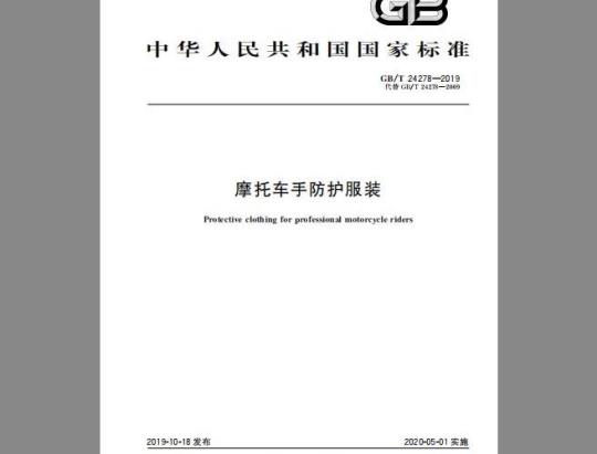 标准介绍:在发生道路交通事故时,能够为摩托车手提供伤害防护的主要是车手穿着的衣物、头盔。因此,摩托车手防护服装宜区别于一般功能性服装,不仅能够对周围的风、水、寒冷等环境提供防护,而且可为摩托车手在事故中避免受到伤害提供一定的防护。另外,穿着摩托车手防护服装时不宜妨碍车手正常驾摩托车