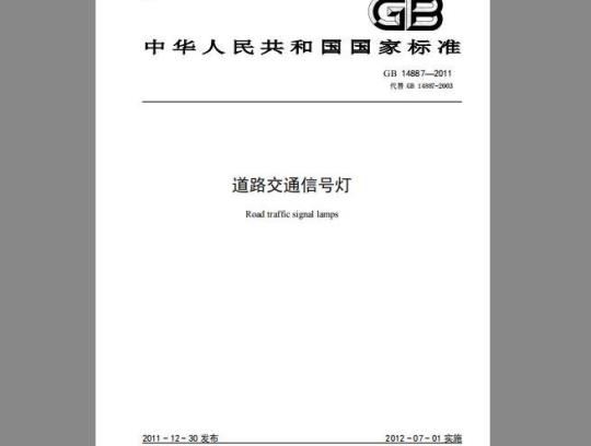 本标准的第4.2条、第5章(第5.1.1条、第5.2.3条、第5.10条、第5.11条、第5.12条、第5.14.7条除外)、第8.1条为强制性的,其余为推荐性的。本标准按照GB/T1.1-2009给出的规则起草。本标准代替GB14887-2003《道路交通信号灯》,与GB14887-2003相比主要修订内容如下:删除了“本标准可用于产品认证”(2003年版的第1章);一删除了“光学系统”、“色片”等术语和定义(2003年版的3.1、3.4):一增加了“面罩”、“电源适配器”、“发光单元”、“出光面”、“幻像”、“信号灯壳体”、“启动响应时间”、“关闭响应时间”、“掉头信号灯”、“盲人过街声响提示装置”等术语和定义;(见3.1、3.2、3.4、3.5、3.8、3.9、3.10、3.11、3.12、3.13);一修改了“按功能分类”(见4.1.4,2003年版的4.1.4):一将“外观、形状、尺寸、组成、分类、命名和标识”修改为“通用要求”,删除了“组成、分类、命名和标识”(见5.1,2003年版的5.1);一将“信号灯的遮沿”要求并入“尺寸和角度”要求中(见5.1.3,2003年版的5.10):一删除了“信号灯颜色、图案及作用”要求(2003年版的5.2);一修改了“无图案信号灯”要求,修改了分类、分级的要求,删除了N形光强分布的要求(见5.2.1,2003年版的5.3.1):
