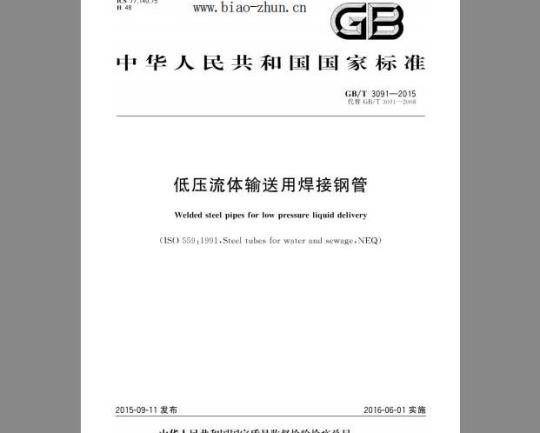标准介绍:本标准代替GB/T3091—2008《低压流体输送用焊接钢管》。本标准与GB/T3091-2008相比,主要技术变化如下: