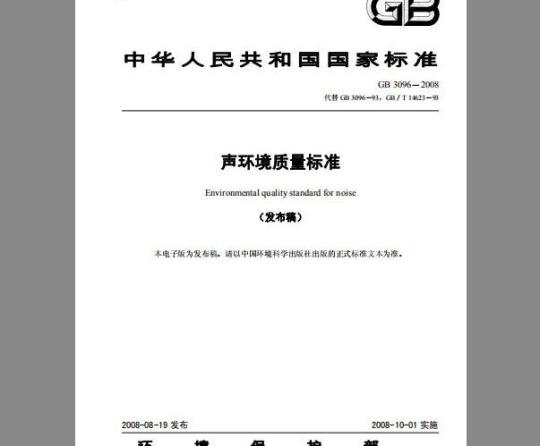 为贯彻《中华人民共和国环境噪声污染防治法》,防治噪声污染,保障城乡居民正常生活、工作和学习的声环境质量,制定本标准。本标准是对GB3096-93《城市区域环境噪声标准》和GB/T14623-93《城市区域环境噪声测量方法》的修订,与原标准相比主要修改内容如下:一一扩大了标准适用区域,将乡村地区纳入标准适用范围;—将环境质量标准与测量方法标准合并为一项标准:一明确了交通干线的定义,对交通干线两侧4类区环境噪声限值作了调整:一提出了声环境功能区监测和噪声敏感建筑物监测的要求。本标准于1982年首次发布,1993年第一次修订,本次为第二次修订。本标准自实施之日起,GB3096-93和GB/T14623-93废止。本标准的附录A为资料性附录:附录B、附录C为规范性附录。本标准由环境保护部科技标准司组织制订。本标准起草单位:中国环境科学研究院、北京市环境保护监测中心、广州市环境监测中心站。本标准环境保护部2008年7月30日批准。本标准自2008年10月1日起实施。本标准由环境保护部解释。