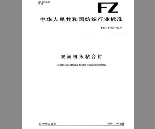 f double side adhesive-bonded woven interlinings以棉,化纤纯纺或混纺纱、漆纶低弹丝为原料制成的机织物为基布,经染整、双面涂层等加工而成的FZ/T64067-2019
