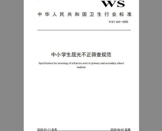 标准介绍:本标准规定了中小学生屈光不正筛查的基本要求、筛査方法、转诊建议及筛查后的要求。本标准适用于开展中小学生屈光不正筛査的医院、疾病预防控制中心、社区卫生服务中心、乡镇卫生院、妇幼保健院和中小学卫生保健机构