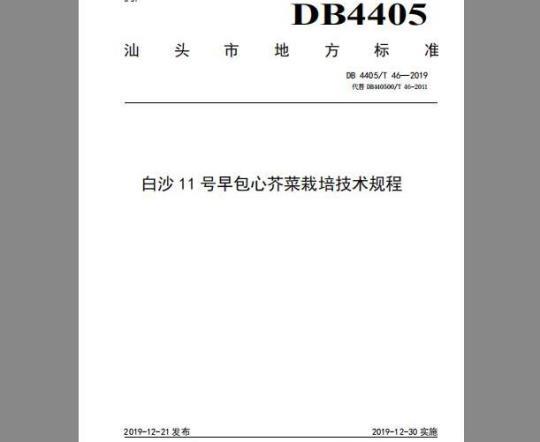 标准介绍:本标准规定了白沙11号早包心芥菜品种的产地环境、生长温度、产量指标、生育进程、栽培技术采收等内容。