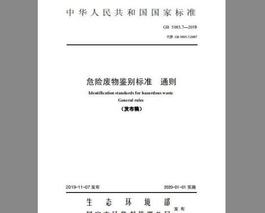 ——进一步细化了危险废物混合和利用处置后判定规则。自本标准实施之日起,《危险废物鉴别标准通则》(GB5085.7-2007)废止。本标准由生态环境部固体废物与化学品司、法规与标准司组织制订。本标准主要起草单位:中国环境科学研究院。本标准由生态环境部2019年9月6日批准。本标准自2020年1月1日起实施