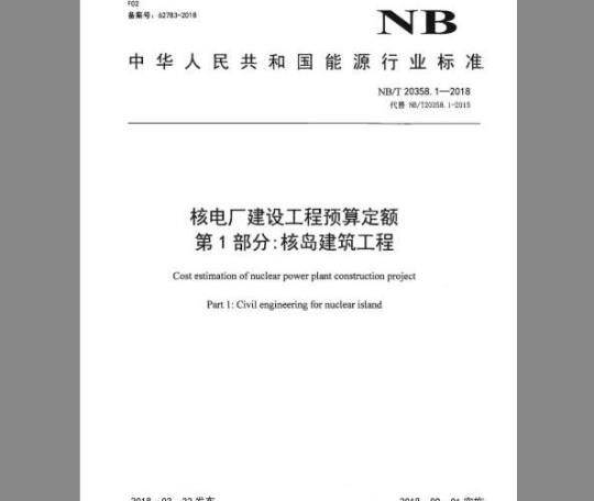 第15部分:模块及钢制安全壳制作第16部分:模块及钢制安全壳拼装和安装本部分为NB/T20358.1-2018核电厂建设工程预算定额》的第1部分:核岛建筑工程(以下称本定额),由国家能源局公告【2018年第2号1发布,批准日期为2018年3月22日,实施日期为2018年9月1日。