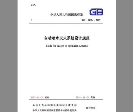 住房城乡建设部关于发布国家标准《自动喷水灭火系统设计规范》的公告现批准《自动喷水灭火系统设计规范》为国家标准,编号为GB50084-2017,自2018年01月01日起实施。其中,第5.0.1、5.0.2、5.0.4、5.0.55.0.6、5.0.7、5.0.8.5.0.15、6.1.3(5).6.2.7、6.5.17.1.3.7.1.4、8.0.2.8.0.310.3.210.3.3、12.0.1、12.0.2、12.0.3条为强制性条文,必须严格执行,原国家标准《自动喷水灭火系统设计规范》GB50084-2001(2005年版)同时废止。本规范电我部标准定额研究所组织中国计划出版社出版发行。