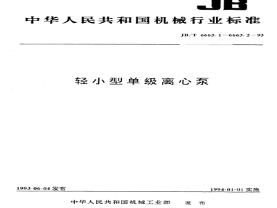 本标准规定了轻小型单级离心泵的的型式、型号和基本参数。 本标准适用于流量为8~400m3/h,扬程为6~90m,工作压力为0.6~1.6MPa的轻小型单级离心泵。 JB/T 6663.1-1993 轻小型单级离心泵 型式与基本参数 JB/T6663.1-1993 标准下载解压密码:www.bzxz.net
