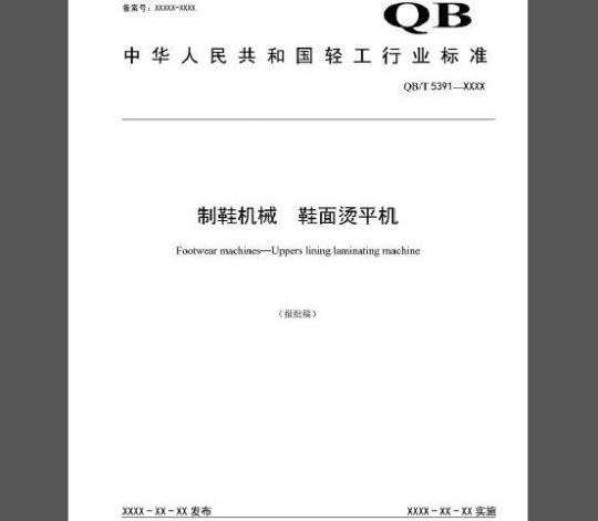 本标准规定了鞋面烫平机的组成、型号及基本参数、要求、试验方法、检验规则、标志、包装、运输和贮存。bZxz.net