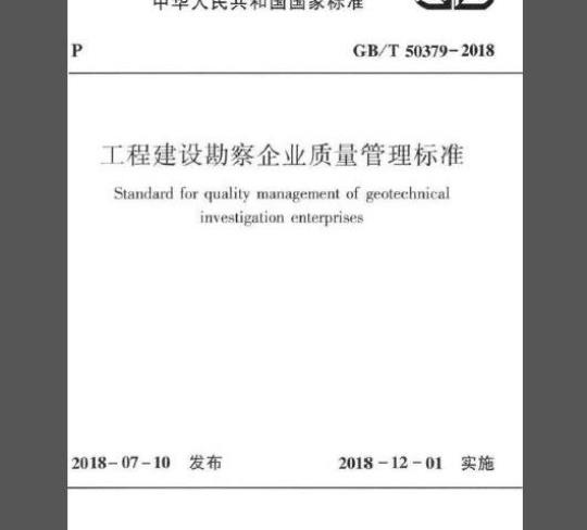 住房城乡建设部关于发布国家标准《工程建设勘察企业质量管理标准》的公告现批准《工程建设勘察企业质量管理标准》为国家标准,编号为GB/T50379-2018,自2018年12月1日起实施。原国家标准《工程建设勘察企业质量管理规范》GB/T50379-2006同时废止。
