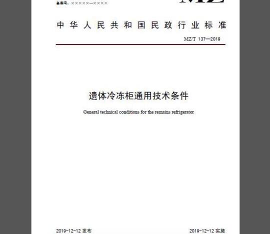 MZ/T 137-2019本标准规定了遗体冷冻柜的术语和定义、型式和基本参数、技术要求、试验方法、检验规则以及标志、包装、运输、贮藏等。