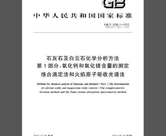 邻二氮杂菲分光光度法和火焰原子吸收光谱法:本部分按照GB/T1.1一2009给出的规则起草。本部分代替GB/T3286.1一1998《石灰石,白云石化学分析方法氧化钙量和氧化镁量的测定》。本部分与GB/T3286.1一1998相比较,主要进行了如下修改:将标准名称改为《石灰石及白云石化学分析方法第1部分:氧化钙和氧化镁含量的测定络合滴定法和火焰原子吸收光谱法》;规范性引用文件取消了引用标准年号,并增加了部分引用标准:一进行了实验室间精密度共同试验,用统计得到的重复性限和再现性限R代替了“允许差”;更改了部分文字表达方式;