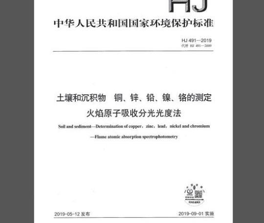 入、《土滚和沉积物铜、锌、铅、镍、铬的测定火焰原子吸收分光光度法》(HJ491一2019)。以上标准白2019年9月「日起实施,由中国环境山版集团出版,标准内容可在牛态环境部网站(kjsmcc.gov.cn/hjbhbz/)查询。