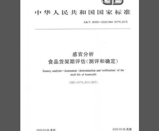 GB/T38493—2020/IS016779:2015食品货架期评估(测评和确定)本标准规定了通过感官检验来测评和确定食品货架期的方法。在设定的储存期内,通过感官检验评价食品在外观、气味、滋味,质地,三叉神经感觉和风味等方面的感官特性变化。本标准为开发具体产品货架期的测定程序提供了指导。即便与本标准使用有关,本标准的主肯也不解决所有安全间题。本标准使用者有责任建立适当的安全与健康保障,并在使用前明确所规定的限制条款,注:估算货架期时,在考虑微生物检测和理化测试结果的同时,还需考虑感言检验结果。2规范性引用文件