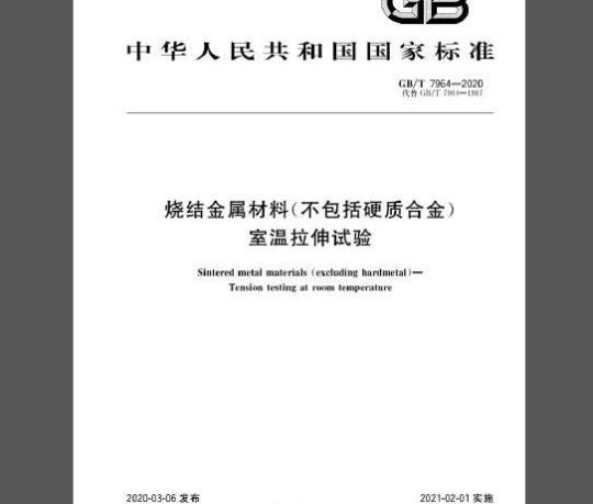 本标准GB/T 7964-2020适用于测定机加工或非机加工的烧结金属材料(硬质合金除外)的屈服强度、规定塑性延伸强度、抗拉强度、断后伸长率和断面收缩率。