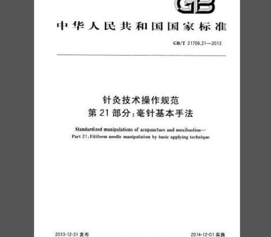 GB/T 21709.21-2013规定了毫针基本手法的术语和定义、施术方法及注意事项。