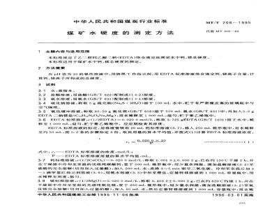 本标准规定了乙,二胺四乙酸二钠(EDTA)络合滴定法测定水中钙、镁总硬度。本标准适用于煤矿水中钙、镁总硬度的测定。2方法提要