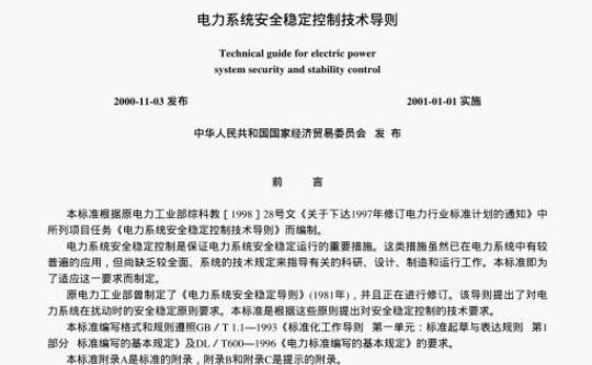 原电力工业部曾制定了《电力系统安全稳定导则》(1981年),并且正在进行修订。该导则提出了对电力系统在扰动时的安全稳定原则要求。本标准是根据这些原则提出对安全稳定控制的技术要求。本标准编写格式和规则遵照GBT1.1-1993《标准化工作导则第一单元:标准起草与表达规则第】部分标准编写的基本规定》及DL/T600一1996《电力标准编写的基本规定》的要求。本标准附录A是标准的附录,附录B和附录C是提示的附录。本标准由中国电机工程学会继电保护专委会提出。本标准由电力行业继电保护标准化技术委员会归口。本标准起草单位:中国电机工程学会电力系统安全稳定控制分专委会和电力自动化研究院。本标准主要起草人:袁季修、孙光辉、李发棣。本标准由电力行业继电保护标准化技术委员会负责解释。目次