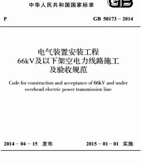 国家标雅《电气装置安装工程66k及以下架空电力线路施及骏妆规范》的公告现批准&电气装叠安装上程66kV及以下架空电力线路施工及验收规范”为国家标推,编号为GB501732014,自2015年1月11起实施。其,第3.2.3(3).5,0.43)、6.1.1(1)条(款)为强制性条文:必须严格热行。原国家标准电气装置安装工程35kV及以下架空电力线路施工及验收规范》GB50173--192同时废止。