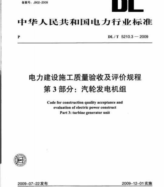 DL/T5210的本部分规定了火力发电工程汽轮发电机组的施工质量验收标准及单项工程施工质量评价、单台机组质量评价和整体工程质量评价的相关要求。本部分适用于新建、扩建和改建的单机容量300MW~1000MW级火力发电工程汽轮发电机组及燃气一蒸汽联合循环发电机组的施工质量验收和工程质评价。300MW以下火力发电机组和核电站常规岛及BOP工程的施工质量验收和工程质量评价,可参照本部分执行。DL/T5210.3—2009