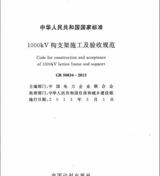 GB 50834-2013.Code for construction and acceptance of 1000kV lattice frame and support.