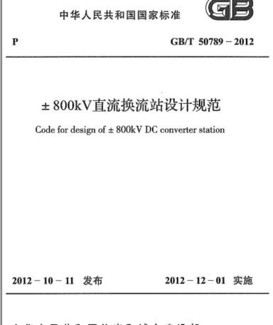 住房城乡建设部关于发布国家标准《土800kV直流换流站设计规范》的公告现批准《土800kV点流换流站设计规范》为国家标准,编号为GB/T50789-—2012,自2012年12月1口起实施。本规范国我部标准定额研究所组织中国订划出版社山版发行。