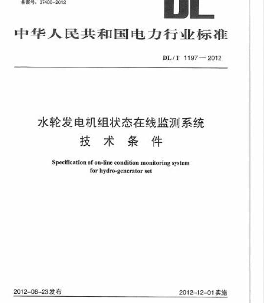 DL/T 1197规定了水轮发电机组状态在线监测系统基本技术要求、试验和检验项目、包装、运输和储存以及技术资料等内容。
