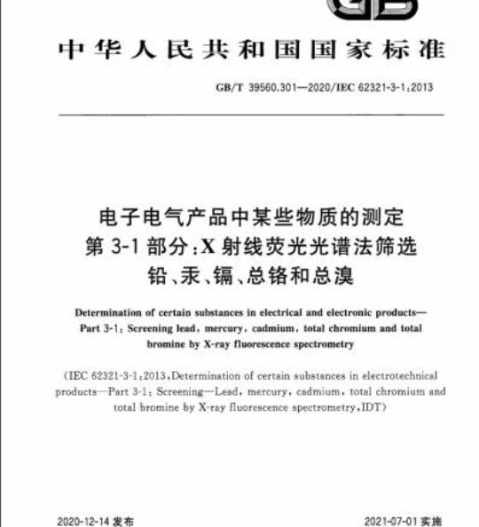 GB/T 39560的本部分规定了X射线荧光光谱法筛选分析电子电气产品均质材料中铅、汞、镉、总铬、总溴五种物质的程序。