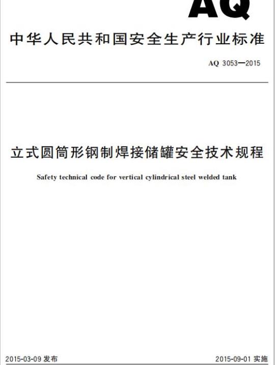 AQ 3053规定了立式圆简形钢制焊接储罐的材料、设计、预制、施工和验收、防雷、防静电.防腐、使用管理、检验和安全附件各方面的基本安全要求。